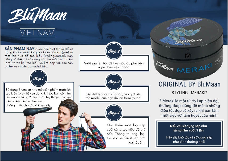 Blumaan Meraki có chất bảo vệ nhiệt trong thành phần nên hay được dùng làm sản phẩm prestyling và finish luôn.