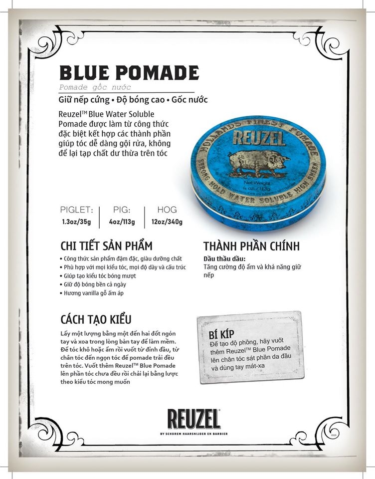 Pomade Reuzel Blue có thể được ví như “heo xanh” lịch lãm đất Hà Lan. Sản phẩm đậm chất Vintage hồi cổ nhưng không kém phần cá tính. Chất bụi, vẻ hào hoa, lịch lãm chắc chắn sẽ là những đặc điểm khiến người ta ghi nhớ và ấn tượng mãi khi sử dụng sản phẩm này. Đặc biệt chất lượng sản phẩm vượt trội từ khả năng dưỡng tóc, giữ nếp đến mùi hương.