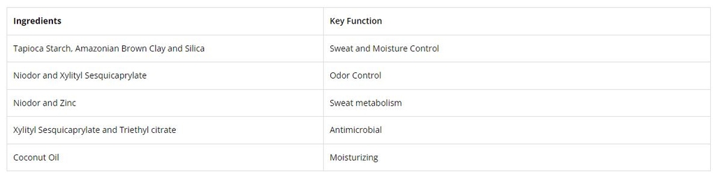 Với Niodor – một thành phần hướng tới tương lai mà các thương hiệu khác sẽ không sử dụng do giá thành cao. Được pha chế KHÔNG CHỨA muối nhôm, sunfat và paraben bằng cách sử dụng hóa học xanh đột phá. Nó tự nhiên ức chế sự phát triển của vi khuẩn gây mùi trong 24 giờ, giữ cho bạn sạch thơm lâu hơn. Nó cũng được sản xuất với thành phần Đất sét nâu Amazonian bền vững, Dầu dừa để giữ cho làn da của bạn ngậm nước, Kẽm và Tinh bột sắn.