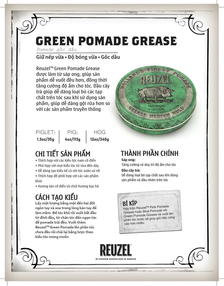 - Pomade Reuzel Green Grease nhắm đến những quý ông hay tạo kiểu tóc cho mình bằng cách sử dụng lược