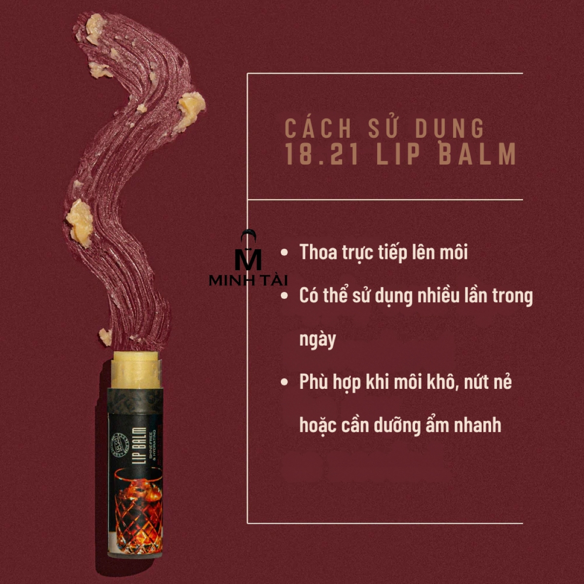 Son dưỡng môi 18.21 Man Made Lip Balm là dòng son dưỡng chuyên biệt dành cho nam giới, tập trung vào khả năng dưỡng ẩm sâu nhưng không tạo độ bóng. Sản phẩm giúp bảo vệ môi trước tình trạng khô nứt do thời tiết, môi trường hoặc sinh hoạt hằng ngày, đồng thời mang hương cam chanh nhẹ lấy cảm hứng từ cocktail Old Fashioned.